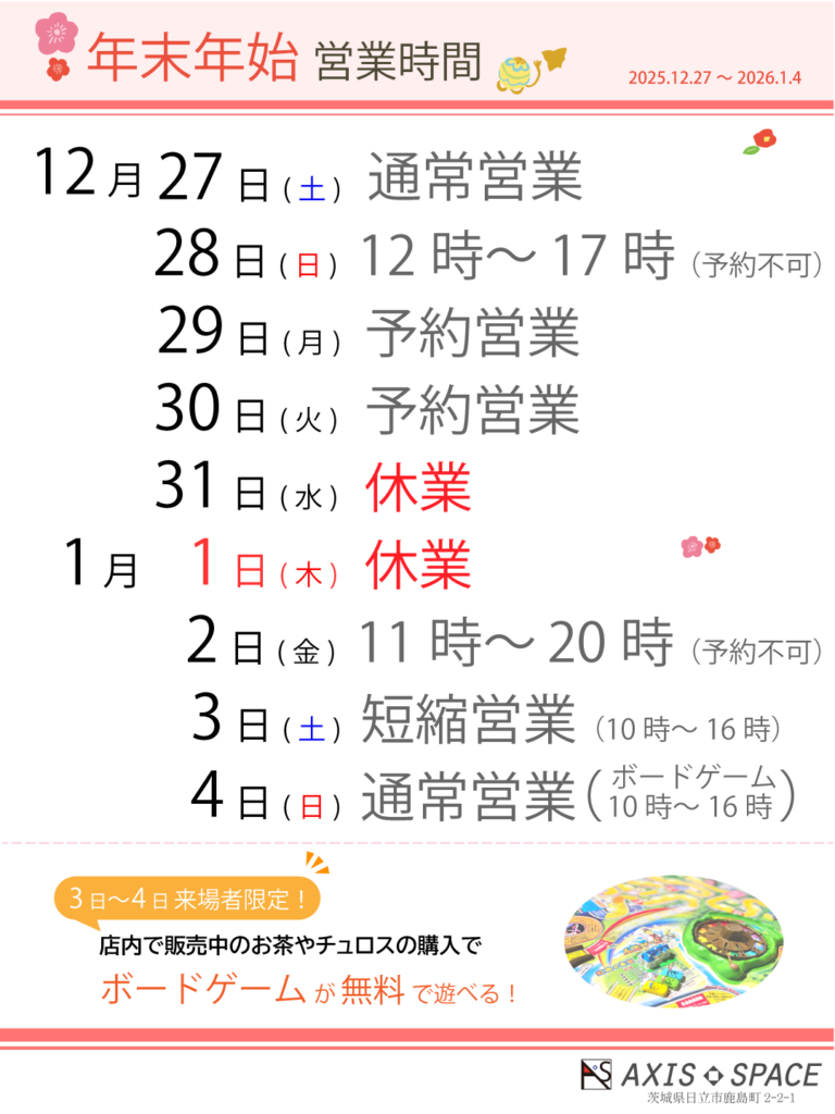 ボードゲームで遊べるイベントは急遽1月3日と4日に開催に変更しました。