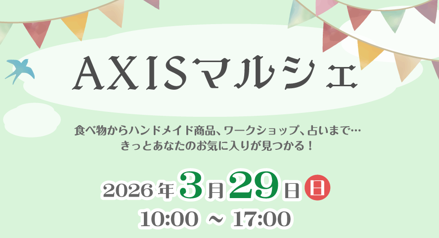 2026-03-29 AXISマルシェ 2026-02-02 最終更新日時 : 2026-02-25 axis-space 開催日: 2026-03-29 10:00 am - 5:00 pmカテゴリー: イベント アクシススペース主催のAXISマルシェが2026年3月29日に開催されます!ワークショップ・飲食・占いなど人気のブースが入ります♪ このイベントに出店希望される方はこちらのフォームよりお申込み下さい。 前回の様子