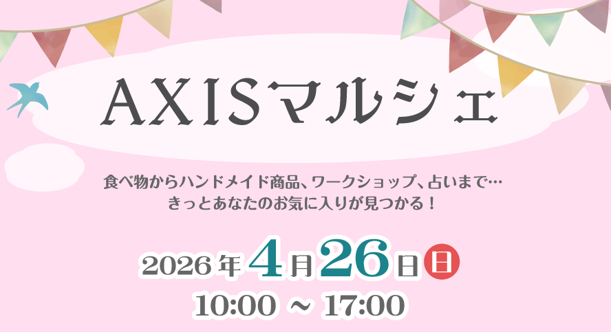 2026-04-26 AXISマルシェ 2026-02-09 最終更新日時 : 2026-02-09 axis-space 開催日: 2026-04-26 10:00 am - 5:00 pmカテゴリー: イベント アクシススペース主催のAXISマルシェが2026年4月26日に開催されます!ワークショップ・飲食・占いなど人気のブースが入ります♪